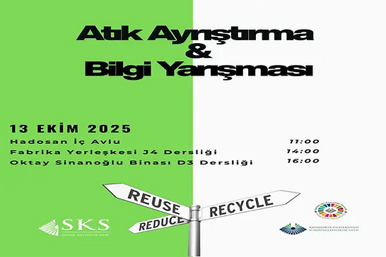 Sürdürülebilirlik Kalkınma Topluluğu ve Sürdürülebilirlik Ofisi tarafından düzenlenen “Atık Ayrıştırma & Bilgi Yarışması” etkinliğinde hem eğlenecek hem de çevreye duyarlı alışkanlıklar hakkında bilginizi pekiştireceksiniz. Doğru atık ayrıştırma pratiklerini öğrenirken, bilgi yarışmasıyla da eğlenceli bir rekabetin parçası olabilirsiniz!