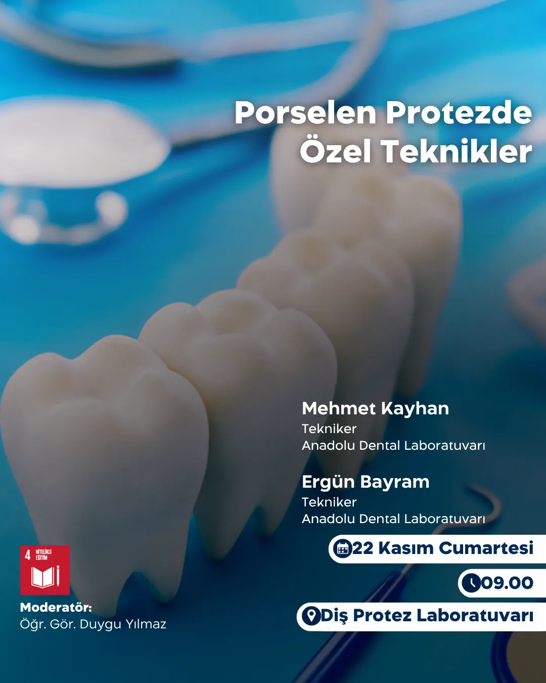 Etkinlik Detayları Konuşmacılar: Mehmet Kayhan, Tekniker, Anadolu Dental Laboratuvarı Ergün Bayram, Tekniker, Anadolu Dental Laboratuvarı Moderatör: Öğr. Gör. Duygu Yılmaz Etkinliği Düzenleyen Bölüm/Program: Diş Protez Teknolojisi Etkinlik Puanı: 10 (Diş Protez Teknolojisi)